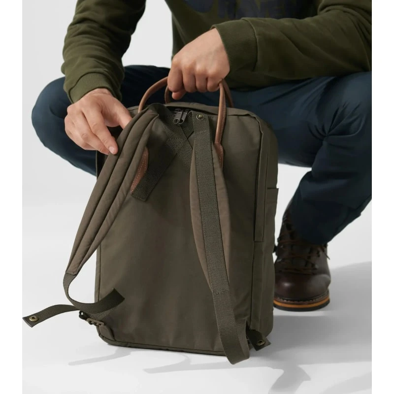 Kånken ryggsekk i G-1000 HeavyDuty Eco med polstret rom til en datamaskin og håndtak og detaljer i skinn. En hverdagsryggsekk med svært lang levetid som har et polstret sitteunderlag og behagelig polstrede skulderremmer.