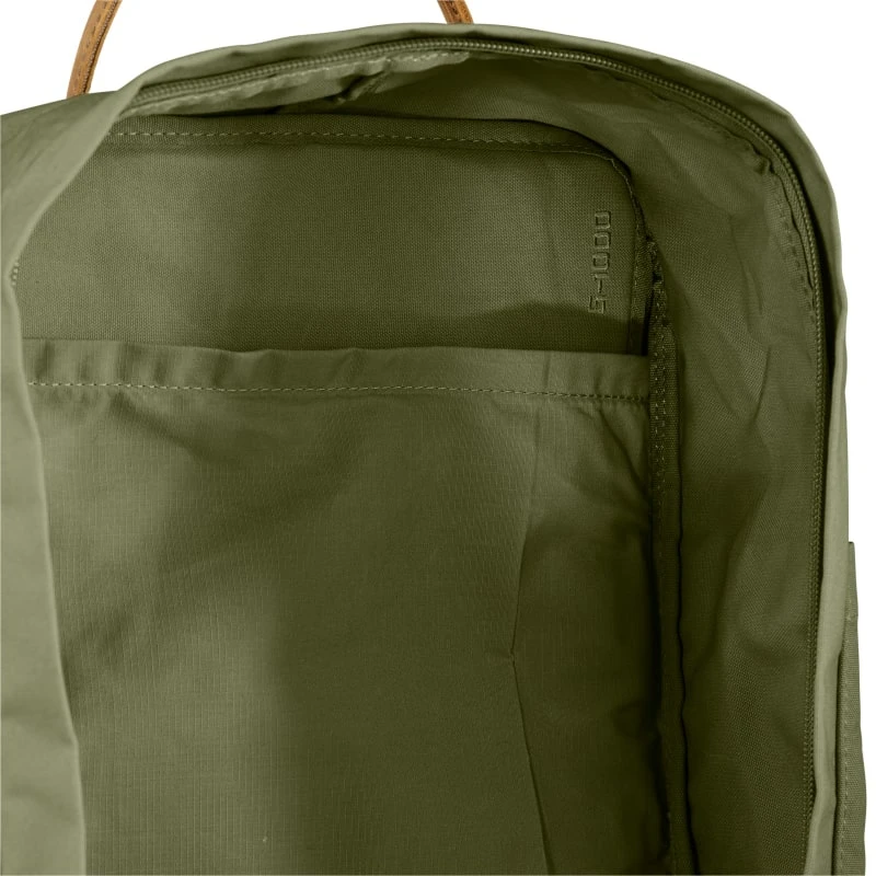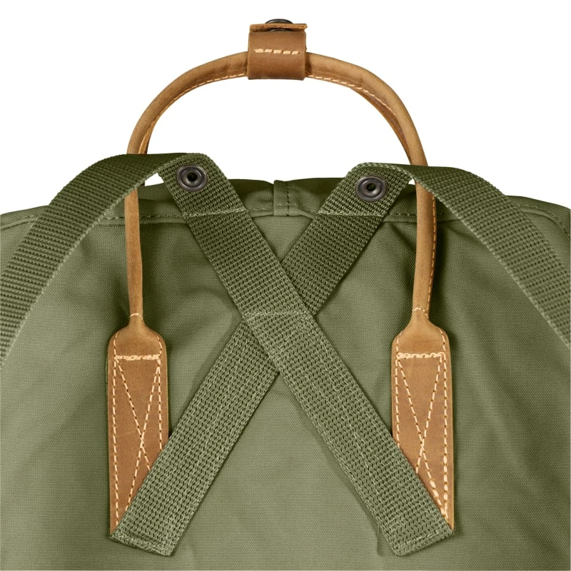 Ryggsekken Kånken i holdbar G-1000 HeavyDuty med håndtak og detaljer i skinn. Stor hovedlomme, lomme foran og polstret sitteunderlag.
