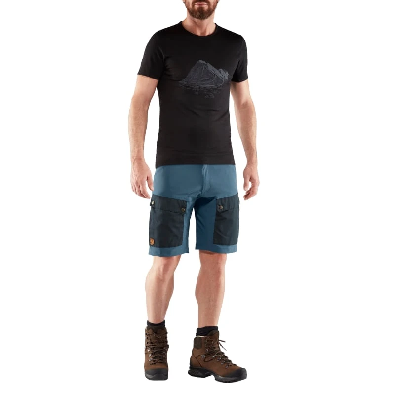 Tekniske turshorts i stretchstoff og G-1000 Eco med resirkulert polyester og økologisk bomull. En del av den prisvinnende Keb-kolleksjonen, nå oppdatert for enda bedre ytelse, passform og slitestyrke. To lommer på bena med klaff, hvorav én har en innerlomme i mesh for mindre gjenstander, for eksempel en mobiltelefon. Håndlommene er høyt plassert slik at ikke innholdet faller ut når du sitter deg ned. En velpassende og slitesterk klassiker for maksimal bevegelsesfrihet på fjellet.