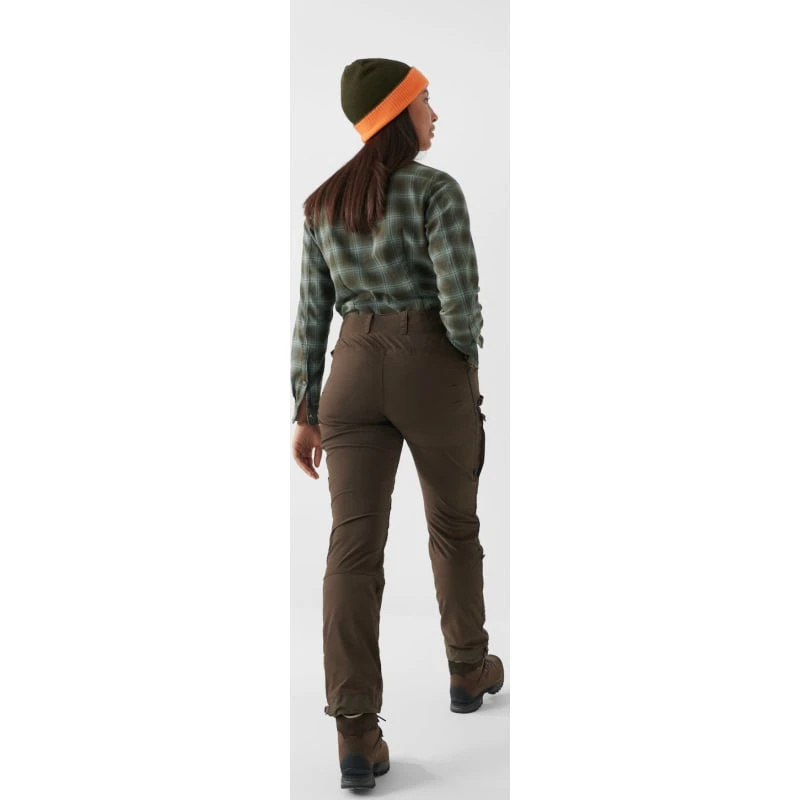 Women’s Forest Hybrid Trousers er lette og slitesterke bukser med optimal passform for aktiv jakt. Laget av et stretchmateriale med G-1000 Silent Eco i sete, foran på lårene, og forsterket fra knærne og ned i G-1000 HeavyDuty Eco. Ventilerende åpning med glidelås, fra hofte til knær og langs anklene, og netting bak ventileringen fra hofte til knær. To lommer på bena med knapp på klaff, en med glidelås og en på innsiden med lomme i netting til telefon eller radio. Stroppejustering med knapper for å sikre buksene nederst i bena, og eget feste til skolisser.