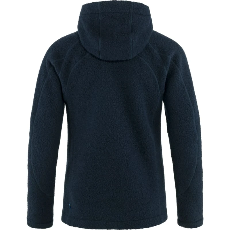 Deilig fleecejakke med lun hette og krøllete, saueskinnslignende overflate. Sydd i funksjonell ullblanding som kombinerer ullens temperaturregulerende egenskaper med polyesterens slitestyrke. Passer godt både som varmende og fukttransporterende mellomlag og som lunt koseplagg etter turen. Lun hette med fôr i mikrofleece som føles myk mot kinnene. Hellang glidelås foran med beskyttelsesklaff ved haken. To håndlommer med glidelås. Nett, kvinnelig modell med vid passform.